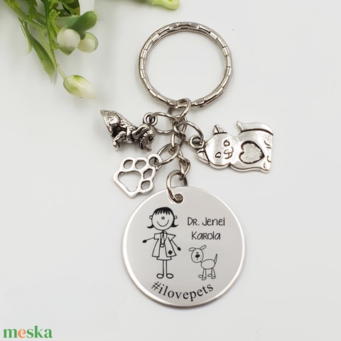 Állatorvosnak ajándék - állatorvosnő kulcstartó grafikával, egyedi névvel, felirattal