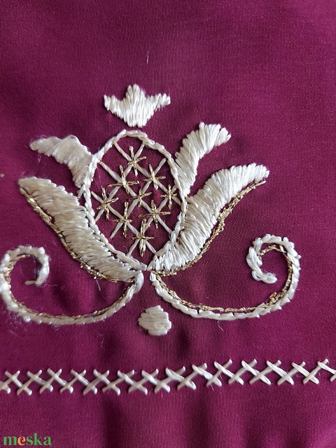 - Anyag/Összetevő hímzés, hímzőfonal, aranyfonal, csipke, selyem