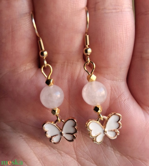 Rózsakvarc pillangós ásvány fülbevaló, arany színű nemesacél akasztóval