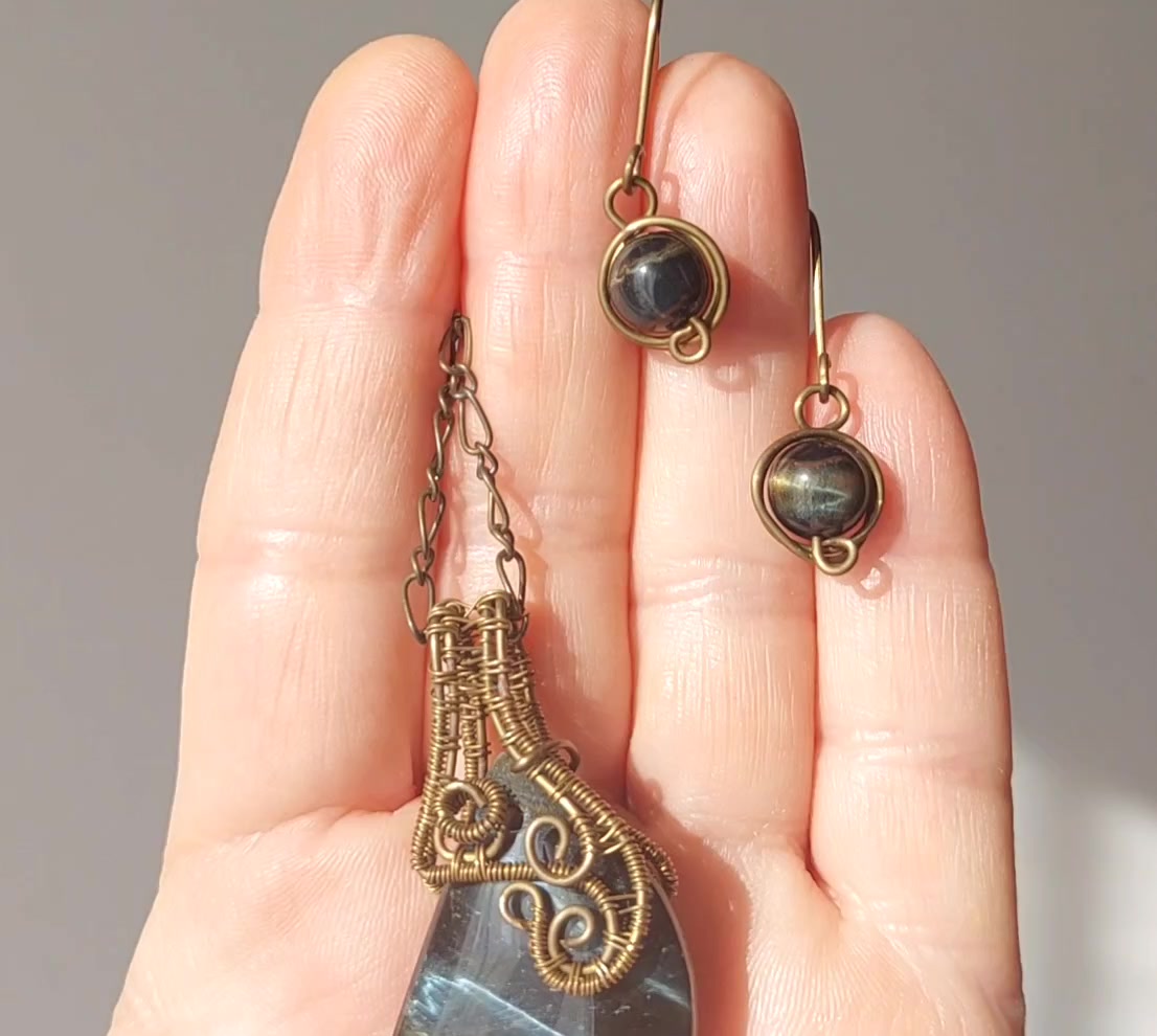 Sólyomszem ásvány sárgaréz drótékszer szett