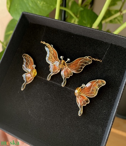 Narancs-fekete pillangós nyaklánc-fülbevaló szett