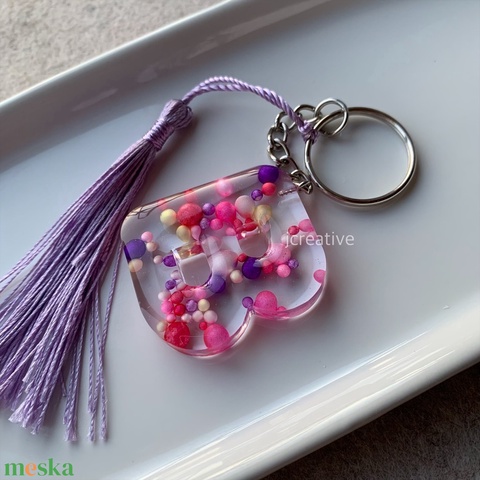 B - betű epoxy kulcstartó, cukorkára hasonlító díszítéssel