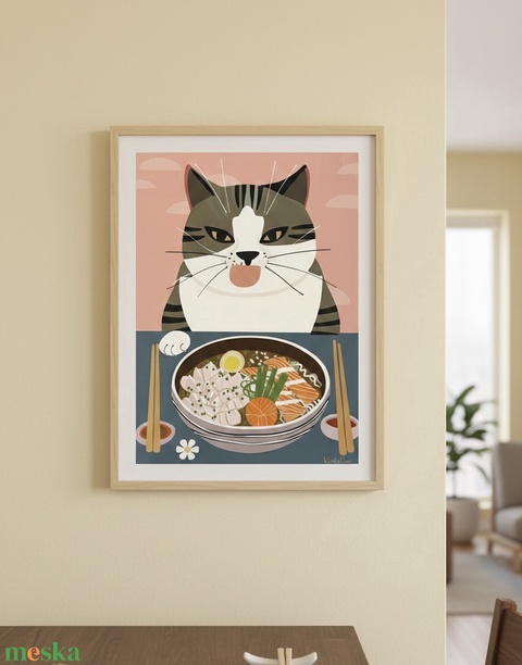 Vidám és egyedi falikép egy sushit élvező macskával. A játékos illusztráció és a különleges téma igazán figyelemfelkeltő dekorációvá teszi a képet, amely garantáltan mosolyt csal az arcokra.