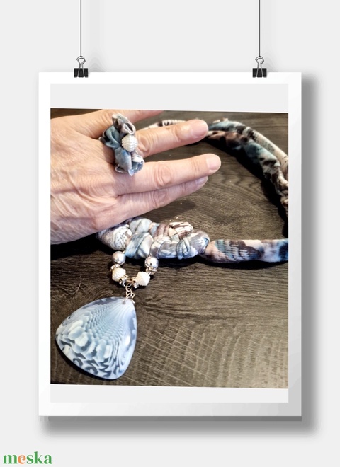 Bohém textil nyaklánc kagyló medállal – egyedi, kézzel készült ékszer gyűrűvel