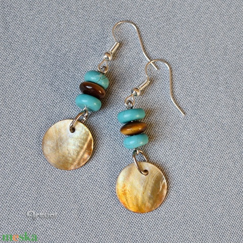 Boho stílusú fülbevaló türkiz és tigrisszem gyöngyökkel kagyló korong fityegővel