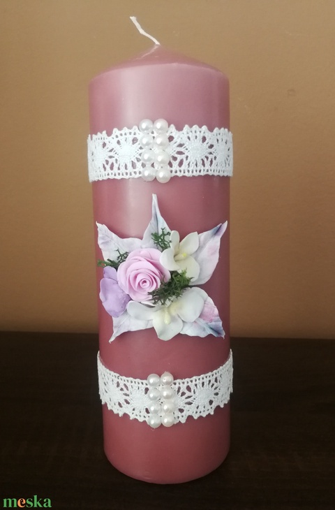 Csipkés agyagvirágos harmónia dekorgyertyán