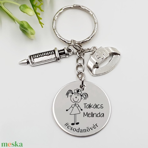Ápolónőnek ajándék - ápolónő kulcstartó grafikával, egyedi névvel, felirattal