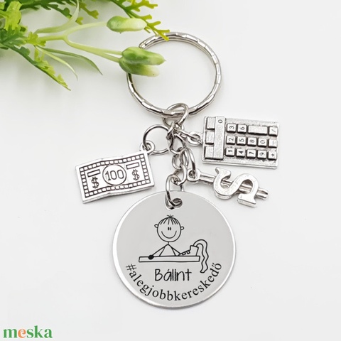 Boltosnak ajándék - kereskedő kulcstartó grafikával, egyedi névvel, felirattal