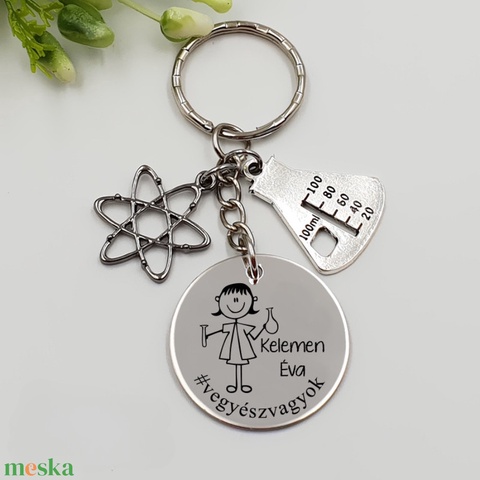 Vegyésznőnek ajándék - vegyésznő kulcstartó grafikával, egyedi névvel, felirattal