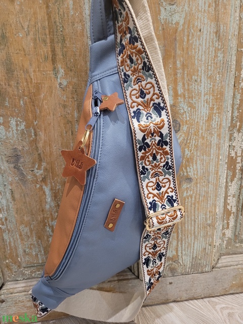 Barna-kék táska.. Övtáska fazonú táska. Testtáska, válltáska, műbőr testtáska. Praktikus, könnyű viselet ez a műbőrből készült táska, elférnek benne az apróbb dolgaid, pl: telefon pénztárca. Városi sétához, kiránduláshoz rendkívül praktikus, könnyű, kényelmes. Bélése pamutvászon, egy cipzáras zseb található benne. Mérete:magassaga: 20 cm szélessége: felül 35 cm alul: 24 cm . Állítható, vagány mintás hevederrel . Valódi bőr cipzárdísszel.