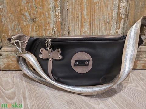Fekete-óarany valódi bőr táska. Ezüstös csillog heveder. Övtáska fazonú valóbőr táska, válltáska, vállon átvethető táska