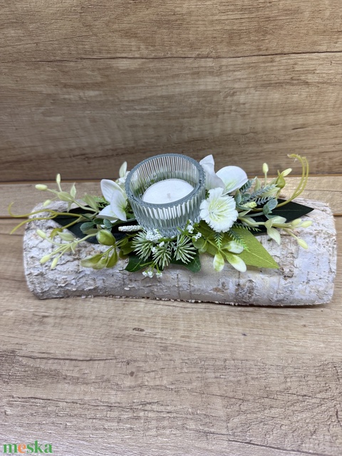 - Anyag/Összetevő selyemvirágok, zöldnövények, mécses, farönk