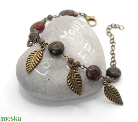 - Anyag/Összetevő picasso jáspis ásványgyöngy, antik bronz összekötő, antik bbronz levél charm, szerelék