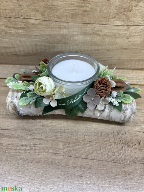 - Anyag/Összetevő selyemvirágok, zöldnövények, mécses, farönk