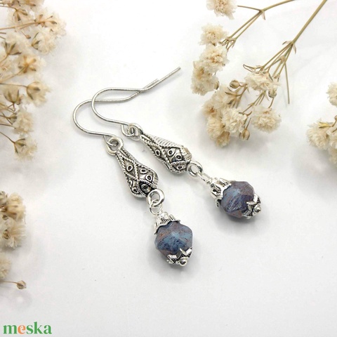 Fülbevaló kékeslila, szabálytalan formájú, cseh üveggyönggyel, csepp alakú összekötőn