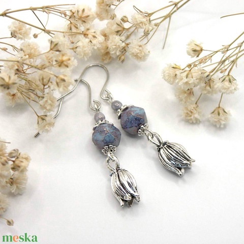 Fülbevaló kékeslila, szabálytalan formájú, cseh üveggyönggyel, virágfej függővel