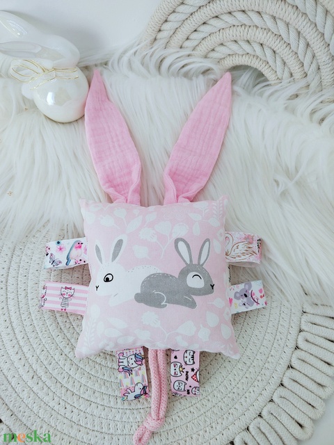 Nyuszis cimkepárna csörgővel.
