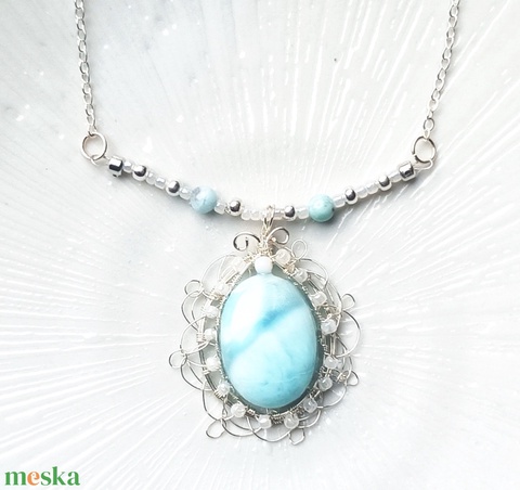 - Anyag/Összetevő rézdrót, larimár ásvány, üveggyöngyök, larimár ásványgyöngy
