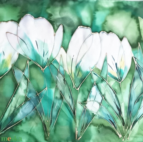 Kézzel festett, művészi és hordható sálak tiszta selyemből. Időtálló érték, természetesen.