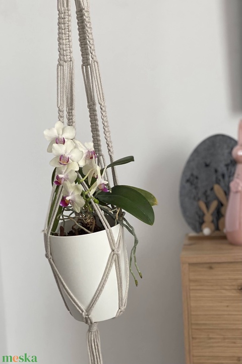 Virágtartó, makramé,világos bézs színű