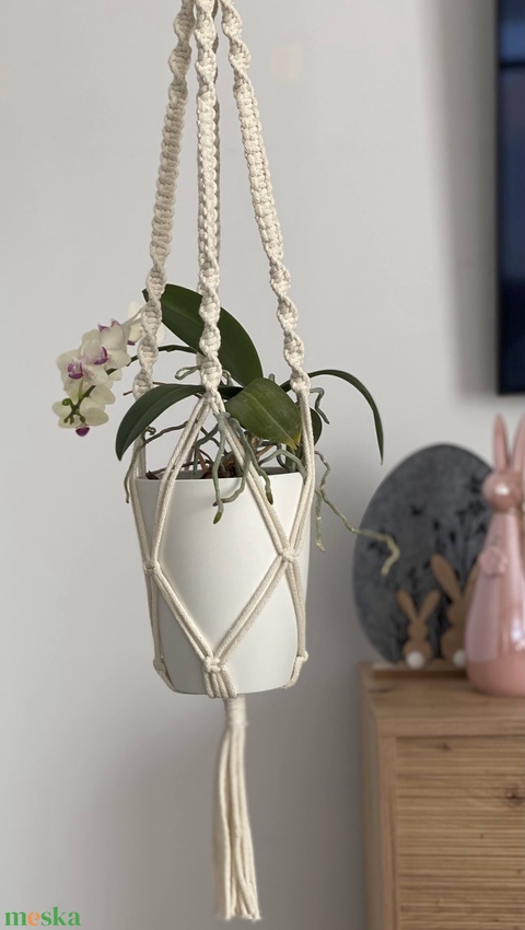 Virágtartó, makramé, krémszínű