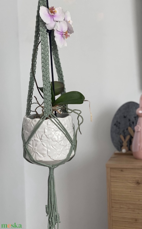 Virágtartó, makramé, almazöd színű