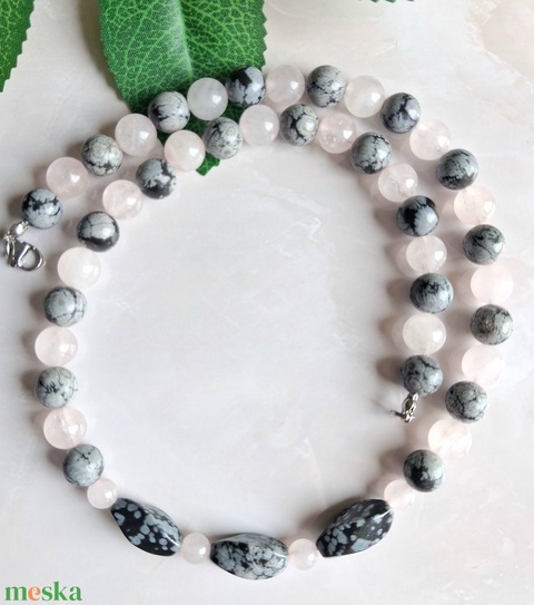 Ásvány nyaklánc- rózsakvarc és hópehely obszidián