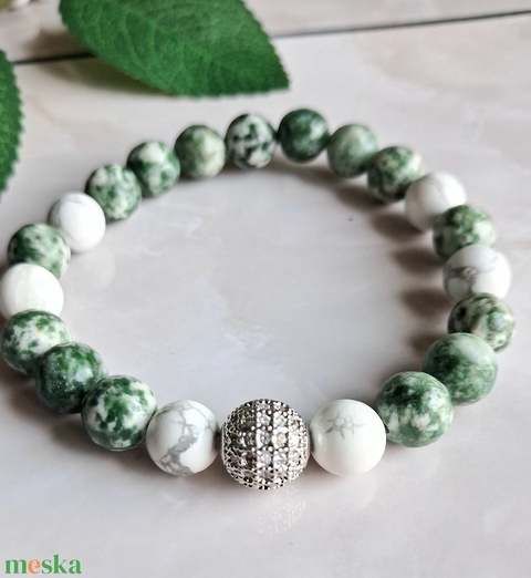 Zöld foltos jáspis ásvány karkötő howlittal és cirkóniás gömbbel