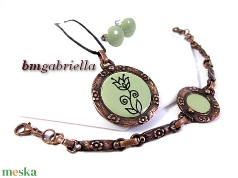 Tűzzománc ékszerszett - világoszöld pötty fülbevaló, tulipán medál, karkötő