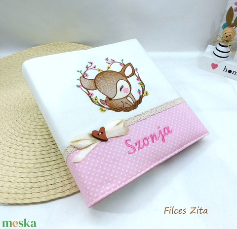 Őzikés névre szóló baba fotóalbum - textil fényképalbum hímzett névvel