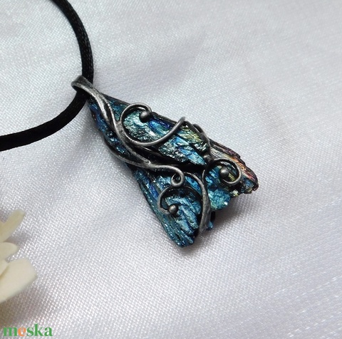A medál Tiffany technikával készült galvanizált fekete kianit (disztén) és ólommentes, ezüsttartalmú ón felhasználásával. A díszítés szintén saját készítésű, nem tartalmaz gyári elemeket. A fémrészt óezüstre patináztam és lelakkoztam, hogy sokáig szép maradjon.