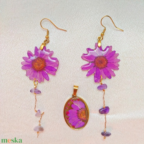 Lila Álom - Valódi virágos műgyanta ékszerszett ametiszt kövekkel
