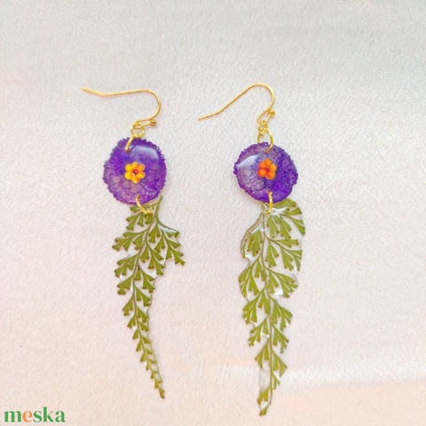 Erdei Varázs - Préselt páfrányos és lila virágos kézműves fülbevaló