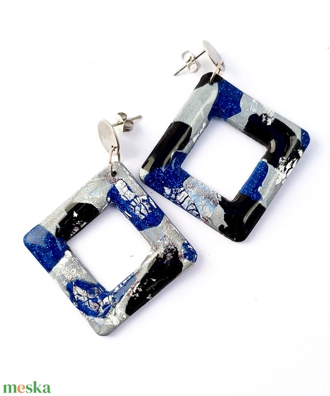 kék-fehér-fekete négyzetes fülbevaló, süthető gyurma