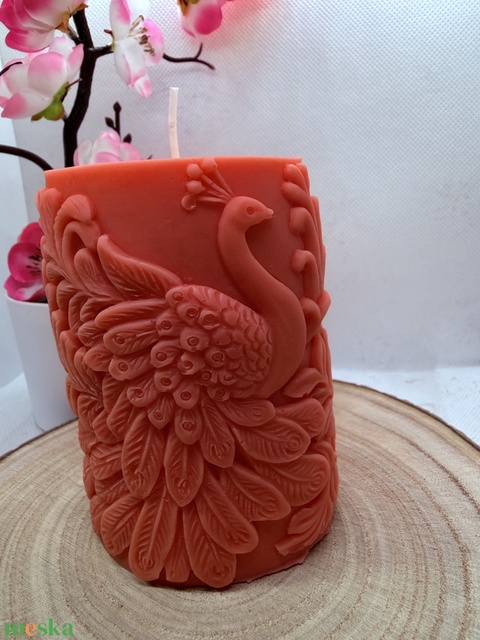 Kézműves pávás díszgyertya - korallpiros színű