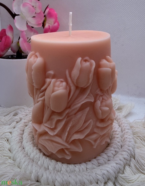 Kézműves tulipánmintás díszgyertya – barackvirág színben