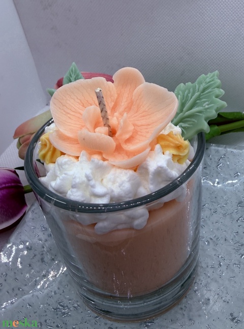 Habos orchideàs szójagyertya – barackvirág árnyalatú, kézműves üveges gyertya