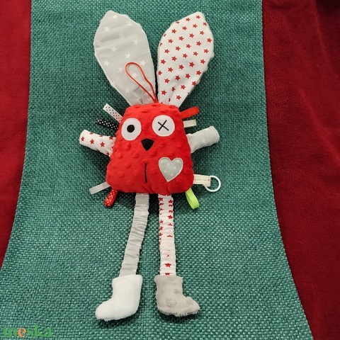 - Anyag/Összetevő minky, selyem hímzőcérna, szalag, pamut vászon, filc, csörgő, gumi