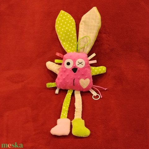 - Anyag/Összetevő minky, selyem hímzőcérna, szalag, pamut vászon, filc, csörgő, gumi