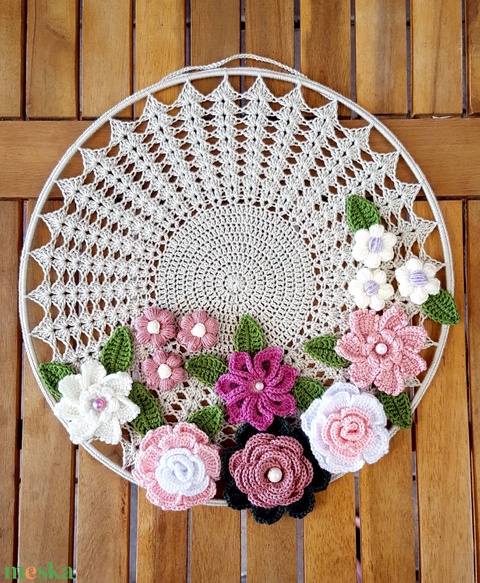Álomfogó horgolt falidísz, függődísz, ablakdísz, fali dekoráció 30 cm