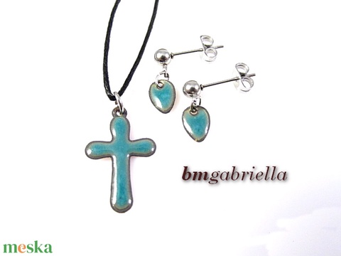 Tűzzománc ékszerszett - világoskék kereszt medál és bedugós csepp fülbevaló