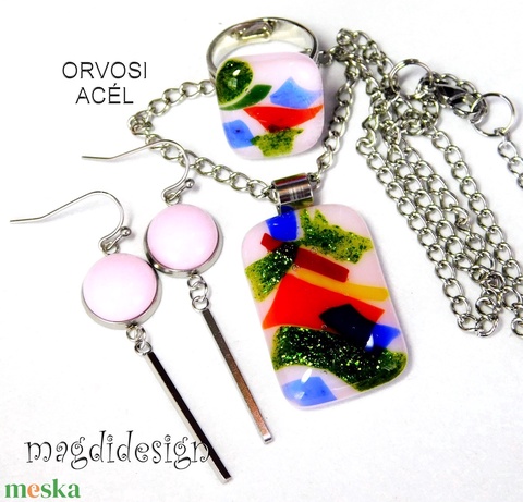 Tavaszirét üvegékszer szett, nyaklánc, gyűrű, lógós fülbevaló