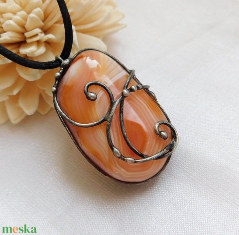 A medál tiffany technikával készült karneol, réz és ólommentes, ezüsttartalmú ón felhasználásával. A díszítés szintén saját készítésű, nem tartalmaz gyári elemeket.A fémrészt óezüstre patináztam és lelakkoztam, hogy sokáig szép maradjon.