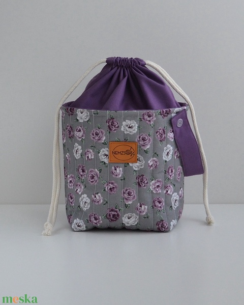 Közepes méretű behúzós projekt táska kézimunkához (lila rózsás)