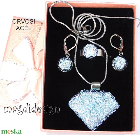 Csillogó ezüst üvegékszer szett, nyaklánc, gyűrű, kapcsos fülbevaló