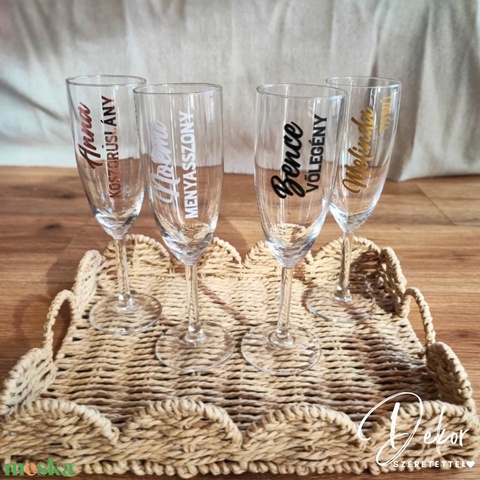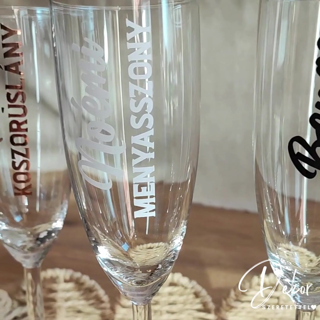 Névre szóló pezsgőspohár esküvőre menyasszonynak, vőlegénynek, koszorúslányoknak, tanúnak