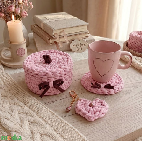 A horgolt, fedeles ékszertartó kosárka, a poháralátét, a szívecske és a karácsonyfadísz rózsaszínű zsinórfonalból és sötétbarna pólófonalból készültek.