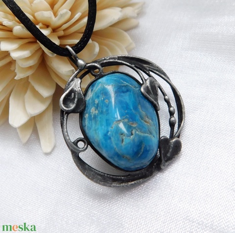 A medál Tiffany technikával készült apatit, réz és ólommentes, ezüsttartalmú ón felhasználásával. A díszítés szintén saját készítésű, nem tartalmaz gyári elemeket. A fémrészt óezüstre patináztam és lelakkoztam, hogy sokáig szép maradjon.