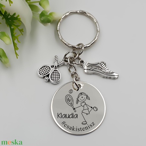 Teniszezőnek ajándék - teniszezőnő kulcstartó grafikával, egyedi névvel, felirattal