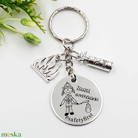 Tűzoltónak ajándék - tűzoltónő kulcstartó grafikával, egyedi névvel, felirattal